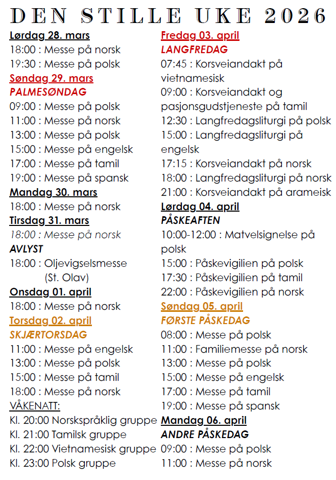 Messetider i Den stille uke Post author:St. Johannes menighet Post published:31. mars 2026 Post category:Messer og andakter Du liker kanskje også Julehefte 2025 2. desember 2025 Gratulerer til våre kommunikanter i norsk og tamilsk messe den 25. mai 2017 30. mai 2017 Gratulerer til våre konfirmanter 20. mai 2017 29. mai 2017